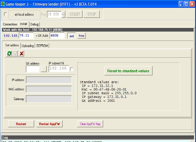 4. В закладке INSTALL прописываем адрес нашего контроллера , после чего нажимаем кнопку SETЧтобы враги без мануала сами не догадались... Очевидно, контроллер при запуске посылает широковещательные пакеты 'я включился, жду контакта...'. По кнопке SET программа начинает слушать сеть, ловит широковещательный пакет, отвечает и устанавливает соединение (видимо UDP - но это, конечно тайна, как и номера портов).